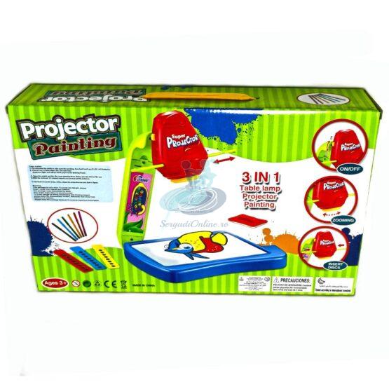 Proiectorul are 3 discuri cu cate 8 imagini diferite ce pot fi proiectate, spre a fi desenate.