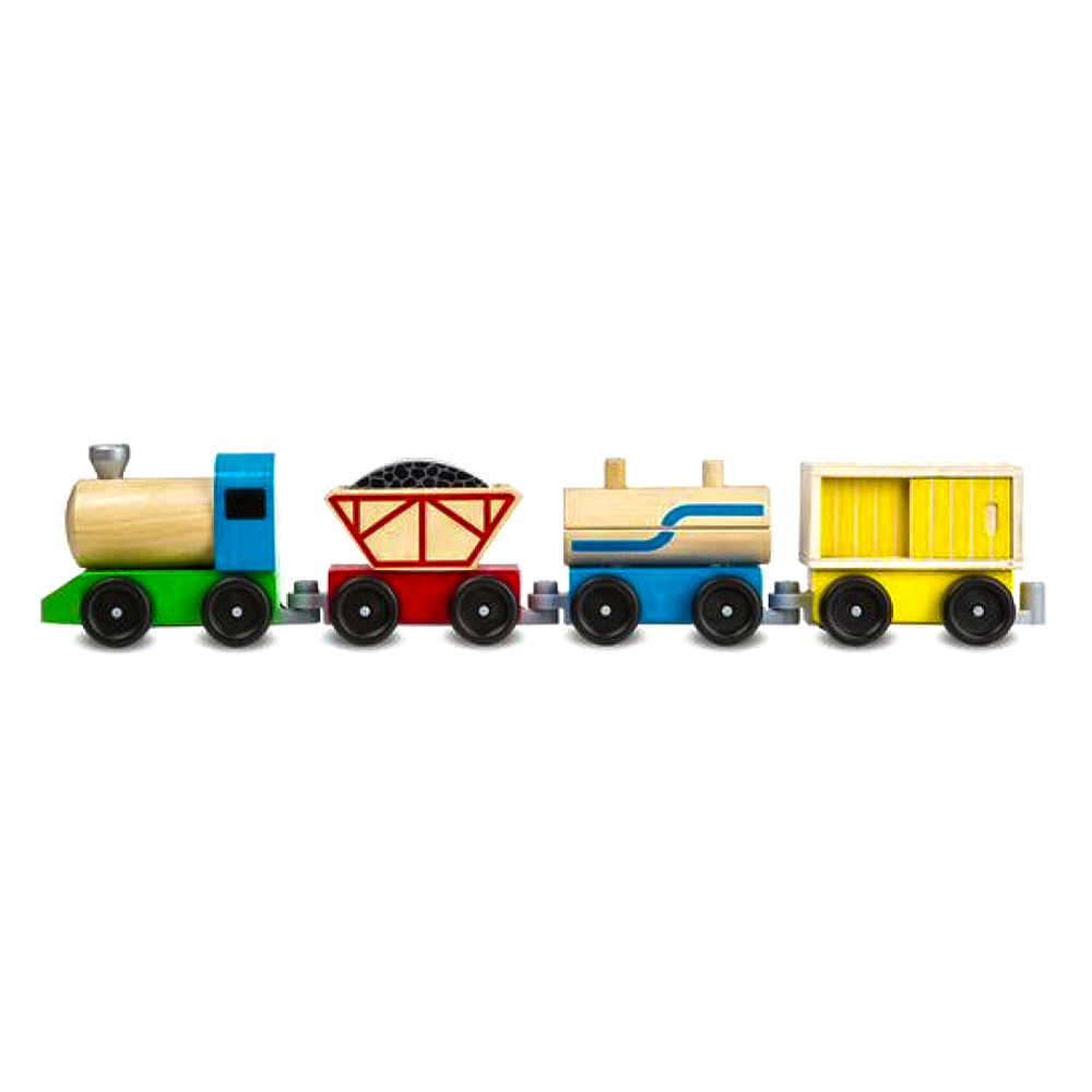 Tren de marfă din lemn cu 3 vagoane cu roți. Include locomotiva, vagon de cărbune, un vagon cisternă si un vagon o cutie de marfă. Vagoanele pot circula independent unul de altul.